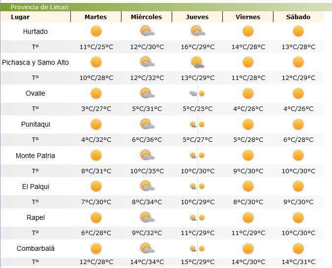 El informe evacuado por la misma red climatológica regional anuncia para hoy temperaturas que alcanzarían hasta los 36 grados en la comuna de Punitaqui; 35 y 34 en Monte Patria y Combarbalá, respectivamente. En la ciudad de Ovalle en tanto las máximas alcanzarían a los 31 grados Celsius.