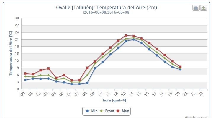 Según la red climatológica del Caza, ayer 8 de junio en la Estación de El Talhuén, que es la más próxima a Ovalle, el mercurio del termómetro descendió a las  6.00 horas hasta casi los dos grados Celcius de temperatura, la más baja hasta el momento.